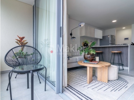 Distribución funcional con cocina abierta integrada al área social, sala-comedor con salida a balcón, zona de ropas independiente, alcoba con vestier y baño privado, además de baño social. Incluye parqueadero cubierto.
